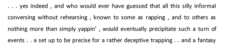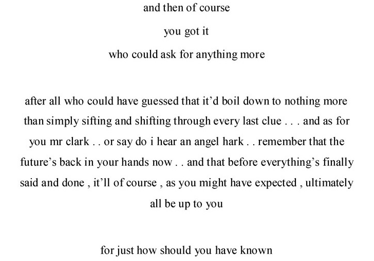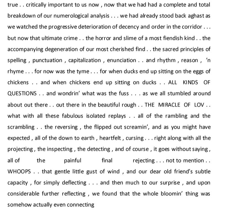 . . . and even as his wold be captors began to gloat , you canprobably see how simply van raft continued to float as he transcended the moat . . . and there then of course, what with all these new possible variations back 'n forth in time 'n space m, it soon became clear why it should be only small matter to bring back in spring , thiose that you thougth to have erased . . . so the next time you're playin with the thoughtof poppin' a candy duck with a chocolate puck , careful not to shoot tourself in the foot in your great haste