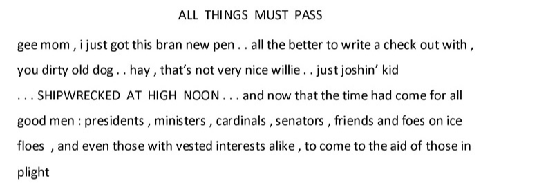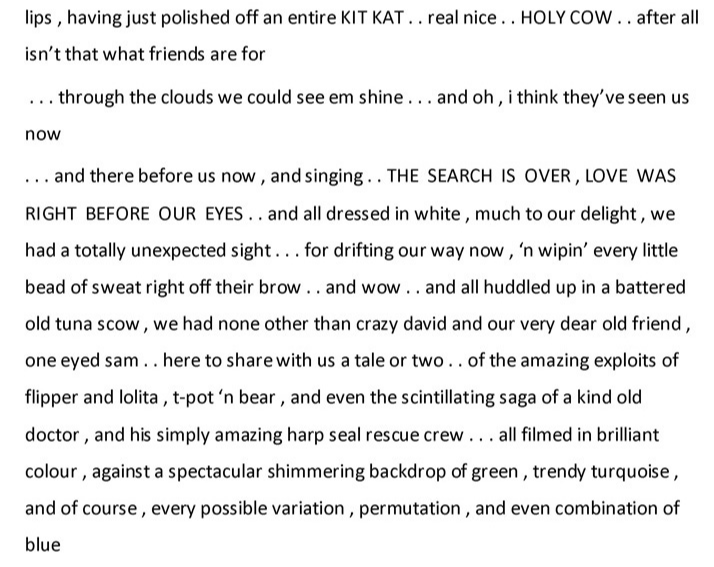 I THOUGHT I WAS . . . and as the kind doctor slipped silently back into his sparkling silvery shell . . back from a pod he thought he climbed so well . . hi there fred . . and then to elude his intense captors : a motley colloection of skin heads , cowboys , tinkers, bag=ffling mop heads , scapegoats , time bandits , catalytic extortionsists , research assistants , splashy spechless fiddle-heads , and vious 'n sundry other fools 'n gouls . . remembering the words of the great prohet hein "a couple of flies in the soup are relatively a lot , whereas a couple of hairson top of your head are relatively few : . c2 . .